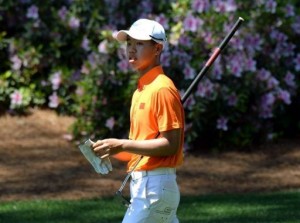 Á 18. holunni stóðu áhorfendur upp og klöppuðu og það var ekki ljóst hvorn þeim þótti koma meira til, hinum vinsæla tvöfalda sigurvegara Masters Ben Crenshaw eða 14 ára stráksins frá Kína, sem hafði spilað svo vel á fyrsta hring!