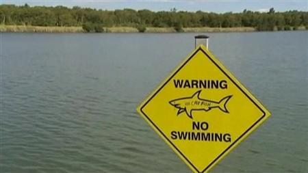 Hákarlarnir hafa nefnilega fjölgað sér og vatnshindrun í Carbrook farin að fá allt aðra merkingu – það borgar sig alls ekki að nota háf til þess að veiða bolta upp úr vatninu við 15. braut Carbrook golfvallarins hvað þá að seilast með hendinni ofan í vatnið þótt glitti í boltann og vatnið virðist ekkert of djupt! Jafnframt er mjög óhefðbundið skilti á við vatnið við 15. braut Carbrook golfvallarins: Bannað að synda!