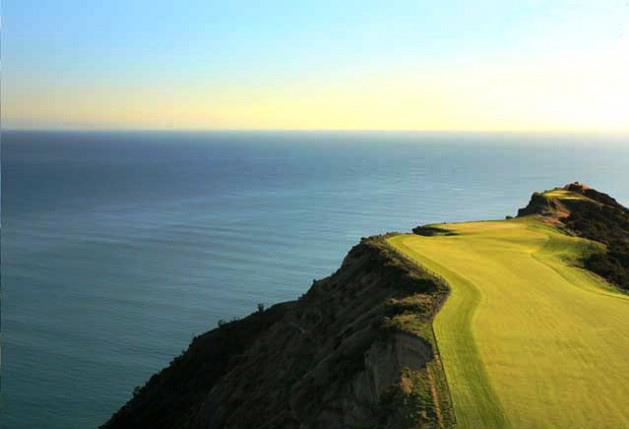 Golfvöllurinn er byggður ofan á klettum og útsýnið þaðan á Kyrrahafið er að sögn engu líkt.