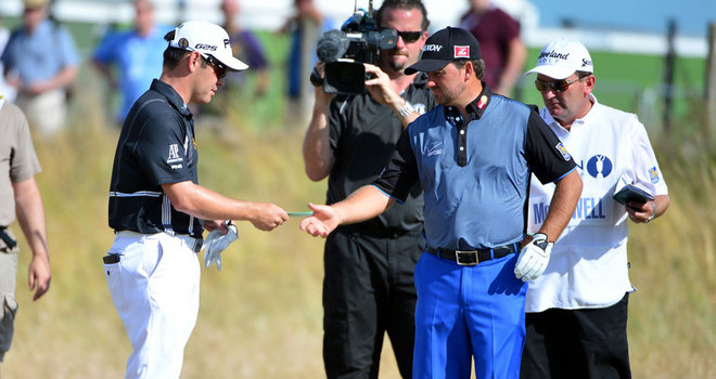 Louis Oosthuizen, meistari Opna breska 2010 varð að draga sig úr keppni á Opna breska í dag, vegna meiðsla í hálsi og hnakka meðan Svíinn Peter Hanson dró sig úr mótinu eftir aðeins 5 holur vegna bakmeiðsla.