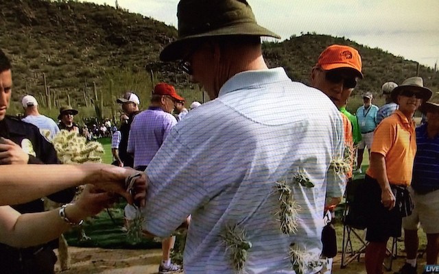 Eitthvað misheppnaðist höggið en boltinn flaug í átt að áhorfanda, sem datt á kaktus (ens. jumping cholla) þegar hann var að reyna að forðast að fá boltann frá Rory í sig.