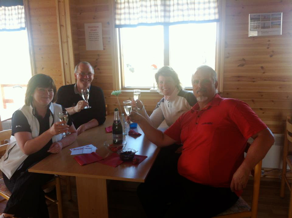 Kolbrúnu Ólafsdóttur (t.h.) afmæliskylfingur ásamt eiginmanni sínum Hilmari Halldórssyni í golfskála GVS á afmælisdaginn ásamt vinafólki sínu Gísla Vagni og Bryndísi. Mynd: Í einkaeigu