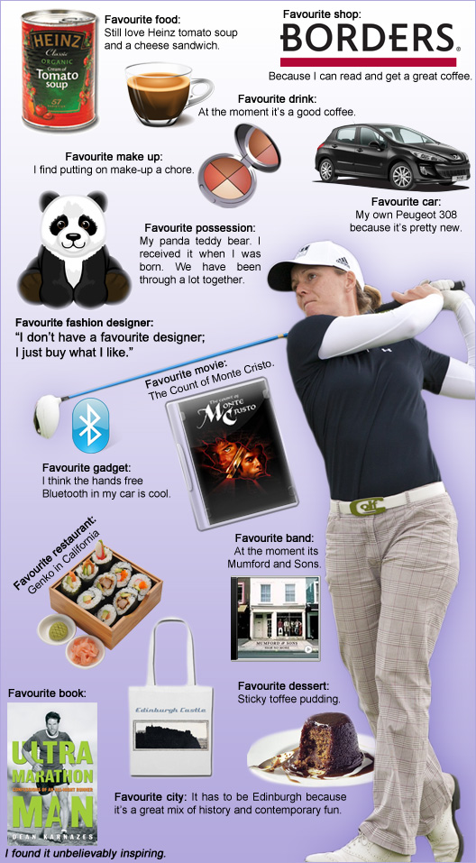 Hér sýnir enn einn skoskur kvenkylfingur á sér hina hliðina en það er Vikki Laing. Hún er frá hinum sögufræga golfstað Musselburgh í Skotlandi. Vikki er fædd 14. mars 1981 og því nýorðin 31 árs. Hér fer mynd af því sem er í uppáhaldi hjá Vikki: