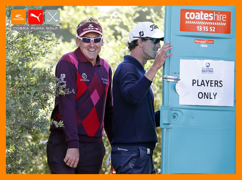 Lesendur eru beðnir að líta á myndina og geta sér til um hvað sé svona fyndið og leggja kylfingunum Ian Poulter og Adam Scott orð í munn.