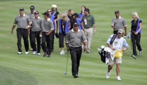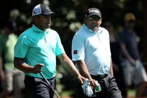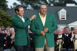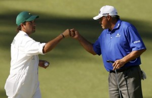 Ángel ásamt syni sínum og kaddý Ángelito á Masters 2013 – Feðgarnir skemmta sér vel. Verður Ángel fyrsti afinn til að sigra á the Masters?