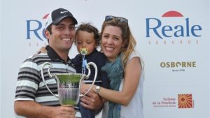 Francesco Molinari ásamt fjölskyldu sinni eiginkonunni Valentínu og syninum Tommasso eftir sigur á Reale Seguros Open de España