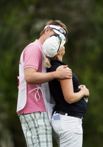 Minea fær stuðning frá kaddý sínum og eiginmanni, Roope Kakko. Þarna er hún að spila ólétt á Dubai Ladies Masters 2009.