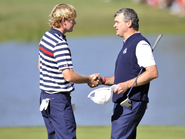 Nýliðinn Brandt Snedeker óskar reynsluboltanum Paul Lawrie til hamingju eftir að sá síðarnefndi sigraði hann í tvímenningsleik þeirra í Medinah á sunnudeginum, 5&3.