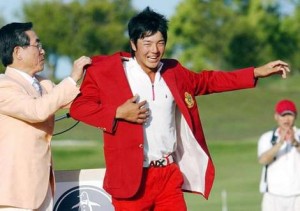 Ryo Ishikawa eftir að hann sigraði Munsingwear Open KSB bikarinn.