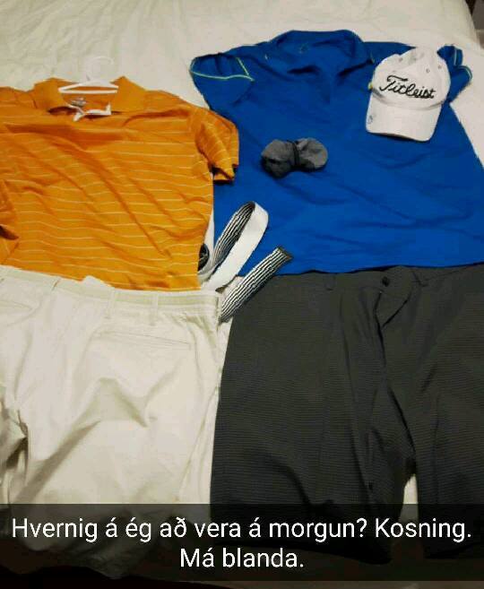 Kosning stendur yfir á Twitter síðu Golfsambands Íslands og sagt að blanda megi saman þ.e. að hann verði í svörtum buxum og appelsínugulum bol eða hvítum buxum og bláum bol.