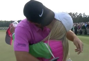 Patrick kyssir Justine eiginkonu sína eftir sigurinn á Masters risamótinu