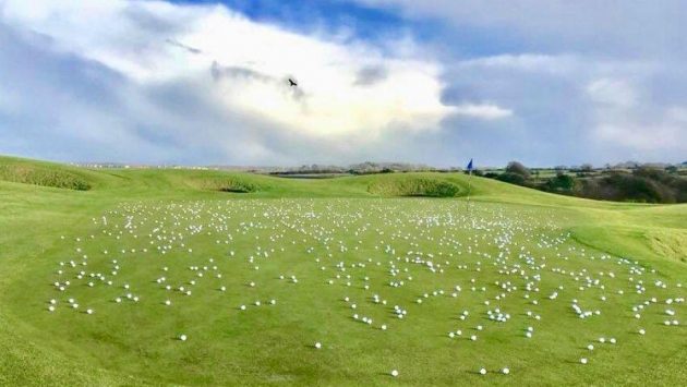 Þetta er flötin á par-3 4. braut Galway Bay Golf Resort á vesturströnd Írlands, þar sem langþreyttir vallarstarfsmenn ákváðu að það væri tími að stappa niður fæti eða öllu heldur stappfylla flötina af golfboltum.