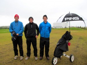 Kristján Benedikt Sveinsson, GA 3. sæti  t.v. og Patrekur Nordqvist Ragnarsson, GR, 2. sæti f.m. Til hægri er Andri Páll Ásgeirsson, GOS, sem varð í 8. sæti í drengjaflokki og var með þeim félögum í ráshóp í dag, 7. september 2014. Mynd: Golf 1