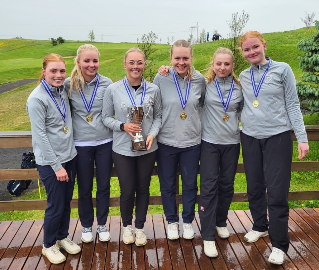 Í aðalmyndaglugga: Íslandsmeistarastúlknasveit GM á Íslandmóti golfklúbba 2023. Mynd: GSÍ