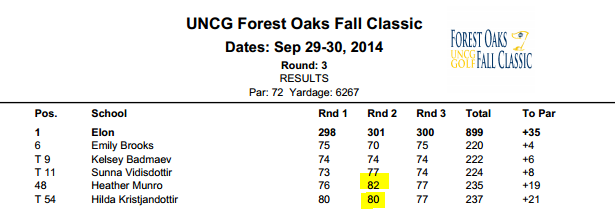 Í þessu fyrsta móti Gunnhildar í bandaríska háskólagolfinu, UNCG Forest Oaks Fall Classic, sem fram fór í Greensboro, Norður-Karólínu varð lið hennar Elon í 1. sæti.