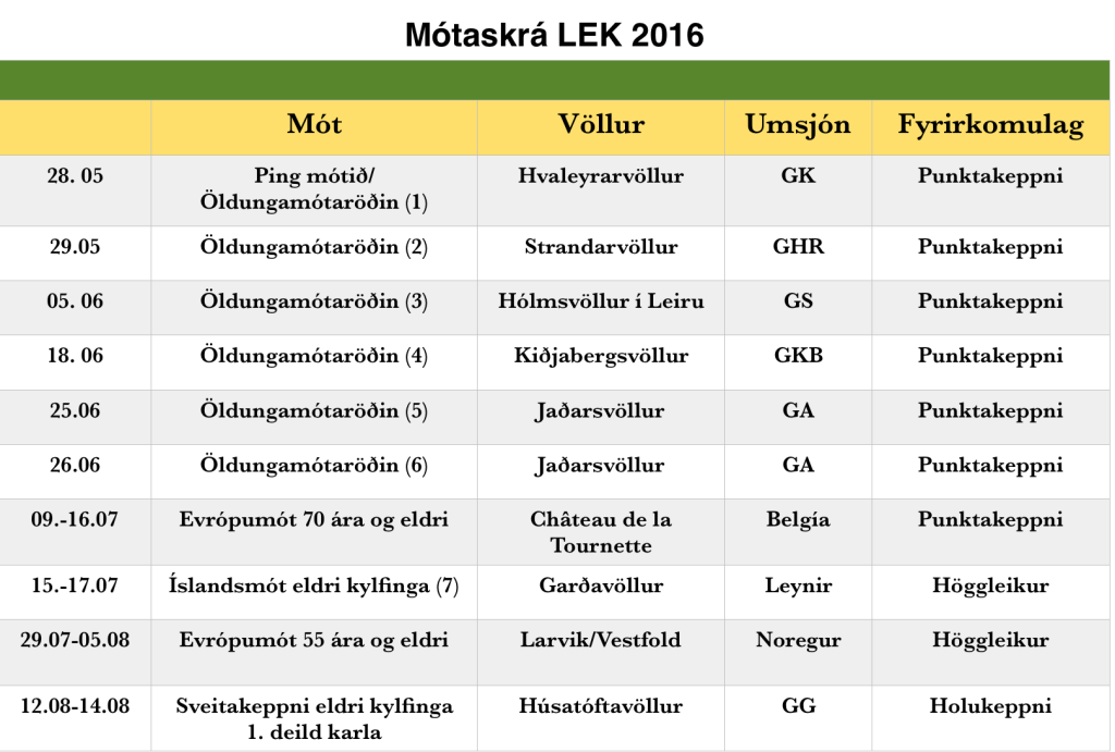 Mótaskrá Landssamtaka eldri kylfinga, LEK, er þétt og fjölbreytt að vanda. Samtökin voru stofnuð árið 1985 og er LEK því að hefja sitt 32. starfsár. Starfsemi LEK hefur farið vaxandi með árunum og sömuleiðis þátttaka í mótum á vegum þess. Ævintýraleg fjölgun hefur orðið á eldri kylfingum frá stofnun LEK árið 1985. Stofnárið munu hafa verið um 200 eldri kylfingar í öllum golfklúbbum landsins og er þá átt við karla 55 ára og eldri og konur 50 ára og eldri, en í dag er talan á sjöunda þúsund.
