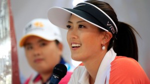 Nr. 1 á heimslistanum Inbee Park í bakgrunni vinstra megin og stjarna dagsins Michelle Wie í forgrunni hægra megin – sigurvegari LPGA Lotte Championship