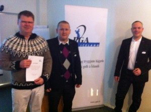 Maggi Birgis - Pútt meistari PGA 2011 - í sigurlaununum - grænu lopapeysunni. Á myndinni eru einnig Einar Lyng (f.m) og Sigurpáll Geir Sveinsson (t.h). Mynd: PGA á Íslandi.