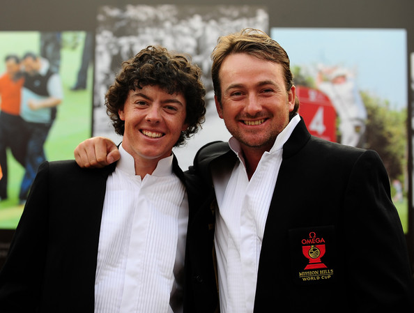 Norður-Írarnir Graeme McDowell og Rory McIlroy verma toppsætið á Omega Mission Hills heimsbikarsmótinu eftir 3. dag mótsins. Þeir komu í hús á -8 undir pari, 64 höggum og eru samtals búnir að spila á 195 höggum (63 68 64). Þeir hafa nú 2 högga forystu á mótinu, hafa spilað á samtals -21 undir pari.