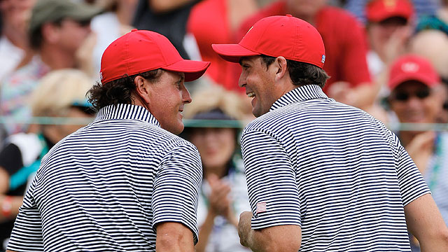 Phil Mickelson og Keegan Bradley unnu þá Jason Day og Graham DeLaet stórt í fyrstu viðureign 2. umferðar Forsetabikarsins.