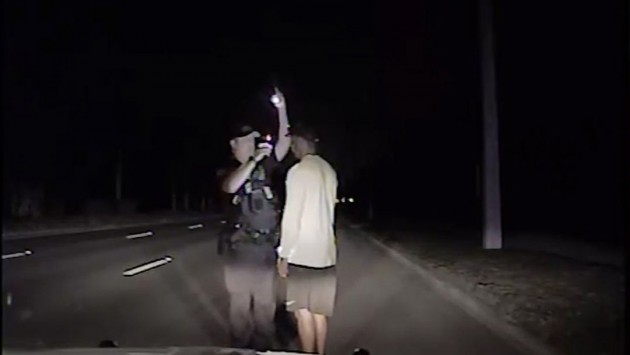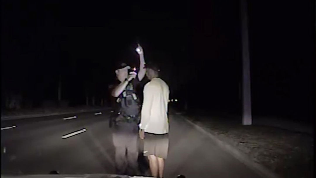 Í meðfylgjandi myndskeiði sést lögreglumaður biðja Tiger um að taka 9 skref og ganga eftir hvítri, beinni línu, en eins og sjá má á Tiger býsna erfitt með það.