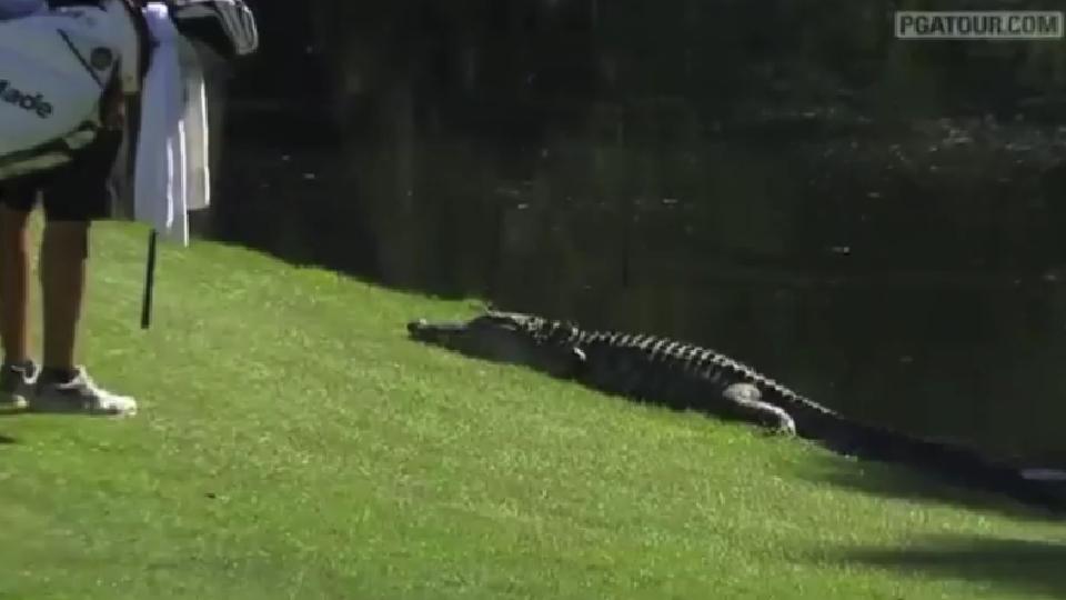 Hér má sjá myndskeið sem sýnir Kip Henley, kylfubera Brian Gay kljást við krókódílinn, þ.e. reynir að stjaka honum burt frá golfbolta vinnuveitanda síns: