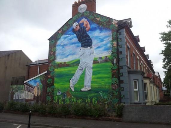 Er einhver kylfingur á leið til Belfast í golf? Ef svo er, er ekki úr vegi að koma við í Damascus Street í suðurhluta borgarinnar og líta á nýjasta listaverk, listamannsins Danny Devenny, sem unnið var að beiðni húseigandans Declan Boyle. Þetta er veggmynd af nr. 2 á heimslista karlkylfinga, Rory McIlroy, sem teygir sig eftir heilli húshlið.