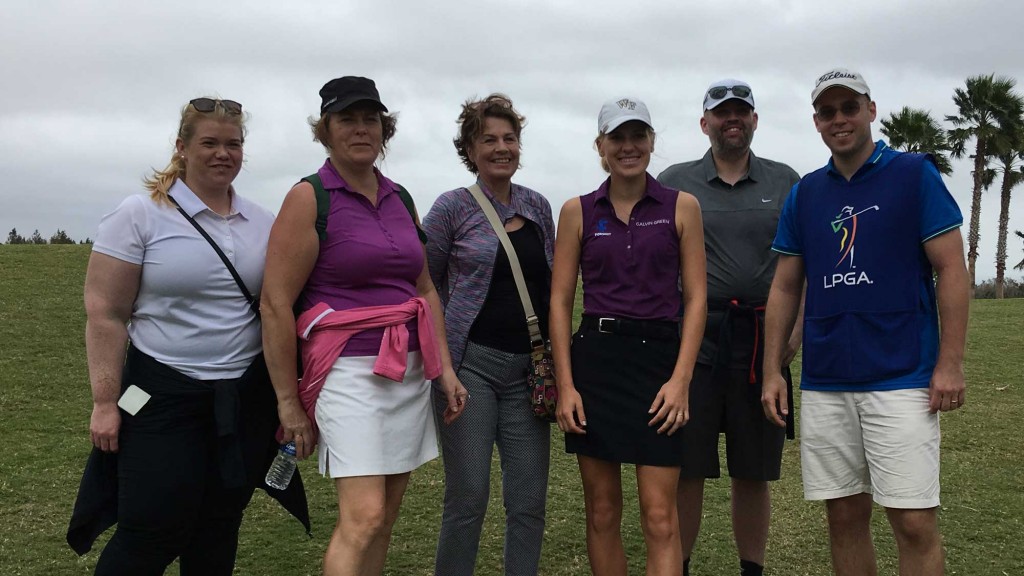 Íslenska stúlkan spilar fyrir áhangendur sem ferðuðust alla leið til þess að hvetja hana þegar hún náði að setja niður 7 fugla og skolla á hring sínum upp á 6 undir pari á 2. degi.