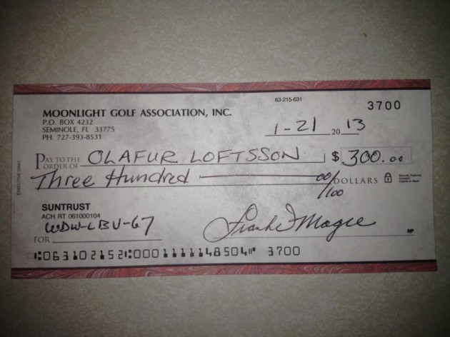 Á Ridgewood Lakes varð Ólafur Björn síðan í 2. sæti með 71 högg, þ.e. miðvikudaginn 23. janúar í s.l. viku og hlaut $ 200 fyrir 2. sætið. Verðlaunaféð er lágt miðað við allan kostnaðinn, sem leggja verður í við uppihald o.s.frv.