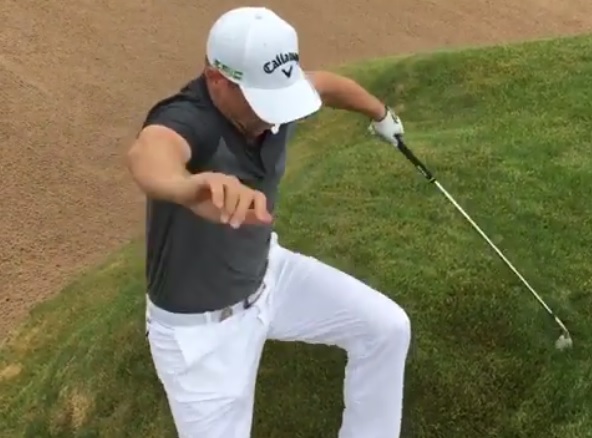 Hér í meðfylgjandi myndskeið má sjá sænska kylfinginn slá upp úr glompu og ……