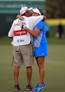 Lexi og Scott pabbi hennar fagna sigri á Omega Dubai Ladies Masters nú fyrr í mánuðinum
