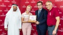 Fyrrum W-7 módelið finnska Minea Blomqvist hlaut handgert OMEGA úr, úr hendi Henri Burrus, sem er svæðisstjóri sölumála í Dubaí, að viðstöddum Mohamed Juma Buamaim, varaformanns og framkvæmdastjóra golfs í Dubaí og Ivan Khodabakhsh, framkvæmdastjóra LET. Minea fór holu í höggi á par-3 7. holuOmega Dubai Ladies Masters í Emirates golfklúbbnum í gær. Hún notaði 7-járnið sitt við höggið góða á holunni sem er 147 yarda (134 metra), en hún er aðeins 2. LET-kylfingurinn sem tekst að fá holu í höggi á holuna. Fyrsti LET-kylfingurinn til að fá ás á holunni var Tanía Elosegui frá Spáni, en Minea er síðan sú 6. í röðinni til að fá ás á holunni af öllum Lesa meira