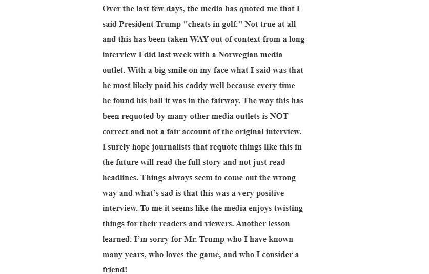 Í greininni, sem birtst hefir á mörgum bandarískum fréttavefum er eftirfarandi haft eftir „norsku frænku okkar“ (Pettersen): „Hann (Trump) svindlar helv… mikið. Þannig að ég veit ekki hvernig hann er í viðskiptum. Þeir segja ef þú svindlir í golfi, svindlir þú líka í viðskiptum.“