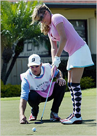 Það eru 4 efstir og jafnir í 1. sæti: Brian Harman, Michael Thompson, hjartaþeginn Eric Crompton og Will McKenzie, en fv. eiginkona hans, Alli, er talin önnur giftu kvennanna, sem Dustin Johnson á að hafa átt vingott við.  Þess mætti get að Alli og Will eru skilin nú en hér að neðan er mynd frá þeim dögum meðan allt lék í lyndi hjá þeim (en þá var Will m.a. kylfusveinn konu sinnar á golfmóti eiginkvenna PGA Tour leikmanna.)