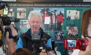 „Ég man eftir því að við þrír (forsetarnir) spiluðum óvenju illa þennan dag,“ sagði Bill Clinton í gær þegar hann talaði við lítinn hóp blaðamanna sem stóð um 3 metra frá glerboxinu þar sem Calamity Jane pútterinn hans frægi er til sýnis. „… Ég flaug hingað og kom beint af vellinum kl. 3 að morgni úr Hvíta húsinu. Ég fékk u.þ.b. 3 klst. svefn… og á 1. teig hook-uðu bæði Ford og Bush og ég sky-aði minn til hægri.“