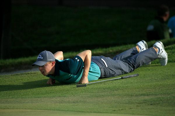 Í aðalmyndaglugga: Matthew Fitzpatrick, sem líkist svolítið kólombíska kylfingnum Camillo Villegas í „kóngulóarstöðunni“ að skoða púttlínu.
