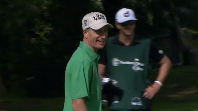 Jim Furyk notaði landslagið til þess að setja niður fugl með chippi af 40 yarda (37,5 metra færi) á Northern Trust Open í gær.