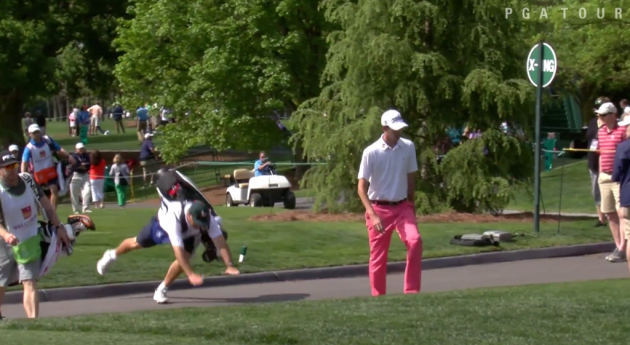 Hér má sjá myndskeið af atvikinu þegar kylfusveinn Chesson Hadley datt SMELLIÐ HÉR: