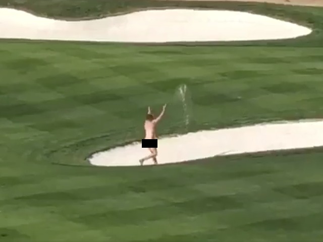 Á hinni sögufrægu par-3 16. braut sem umlukin er áhorfendapöllum, sem mörg þúsundir áhorfenda verja tíma sínum til að fylgjast með keppendum hljóp nakinn maður um á brautinni.