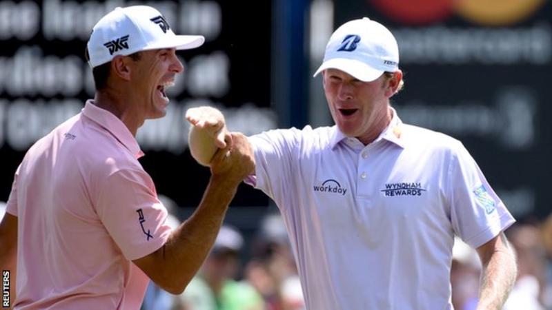 Í aðalfréttaglugga: Billy Horschel fagnar 59-unni með Brandt Snedeker eftir að sá síðarnefndi setti niður lokapúttið.