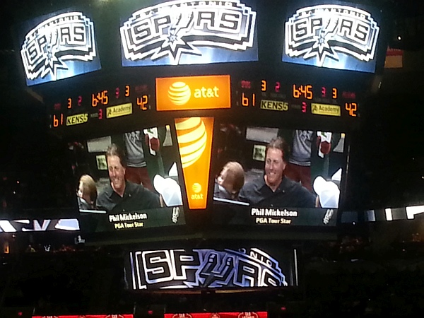 Mickelson veifaði til áhorfenda og Amanda dóttir hans fékk Spurs stuttermabol.