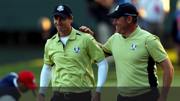 Félagi hans í evrópska liðinu Lee Westwood, sem nú tekur þátt í 8. keppni sinni lagði ekki einn einasta fugl í púkkið, en saman komu þeir færandi hendi fyrir Evrópu og urðu til þess að staðan eftir gærdaginn er 5-3.