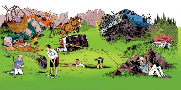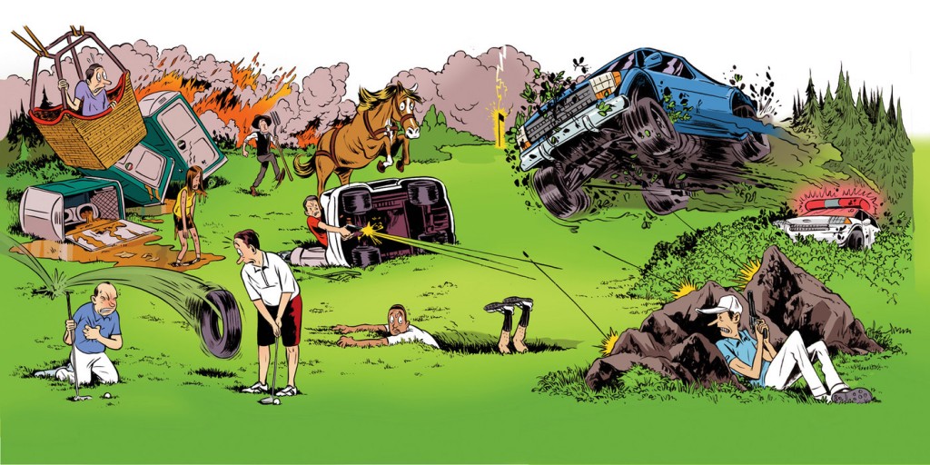 Golfvöllurinn er rólegur staður þar sem hægt er að flýja raunveruleikann, en stundum er það sem gerist þar skrítnara en raunveruleikinn. Nick Price drævaði eitt sinn golfbolta og hann festist í óæðri enda svíns. Golf Digest bað þá sem „followa” blaðið á félagsmiðlunum (Twitter og Facebook) að deila skrítnustu sögum sínum af golfvellinum. Þar á meðal eru nokkur atriði sem virkilega koma á óvart; t.a.m. óheppni kylfingurinn sem leitaði skjóls fyrir stormi innan í færanlegu klósettu, en síðan feykti vindurinn færanlega klósettið út í móa. Við hér á Golf 1 ætlum að spara ykkur skítugu smáatriðin en hér fara nokkrar sögur sem okkur fundust skemmtilegar: