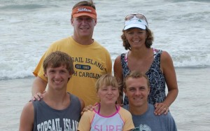 Pabbinn Shawn (efri röð t.v.) og mamman Chris (efri röð t. h.) með börnin sín: F.v.: Steven, Ellie og Jordan Spieth í fríi á Wilmington Beach í N-Karólínu. Jordan elskar að fara þangað á ströndina, í frí.
