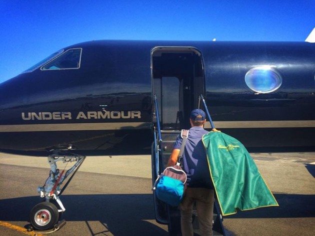 Hann setti meðfylgjandi mynd inn á facebook síðu sína, en þar má sjá hann fara um borð í einkaþotu sem einn styrktaraðila hans Under Armour sendi eftir honum.