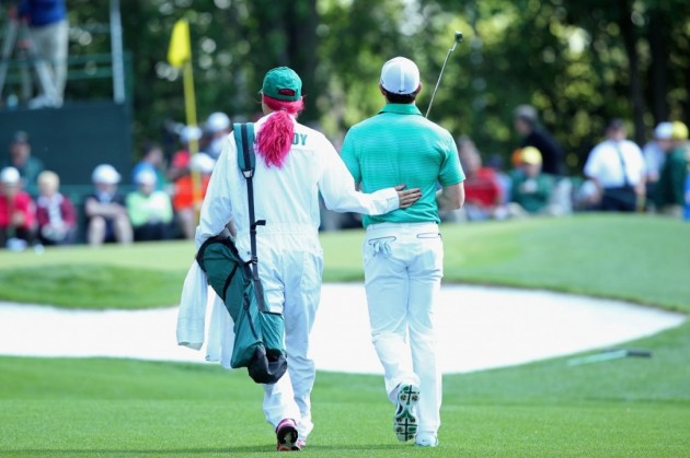 Engar reglur eru þó um það hvaða háralit kylfuberar skuli vera með og því gaf stríðniskjóinn Caroline Wozniacki, kærasta Rory allri íhaldseminni langt nef og mætti með bleikt hár til leiks í par-3 holu keppni Masters mótsins, sem væntanlega hefir farið í þær allrafínustu á þeim allraíhaldsömustu.