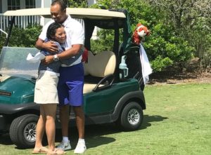 Pratima Sherpa frá Nepal faðmar Tiger, sem er hvatning hennar í golfinu!