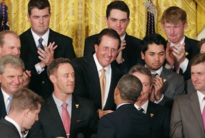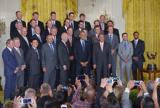 3 mestu kylfingar í Hvíta húsinu: Obama, varaforsetinn Joe Biden og þingmaðurinn John Boehner (speaker of the House) tóku á móti Forsetabikarsliðinu.