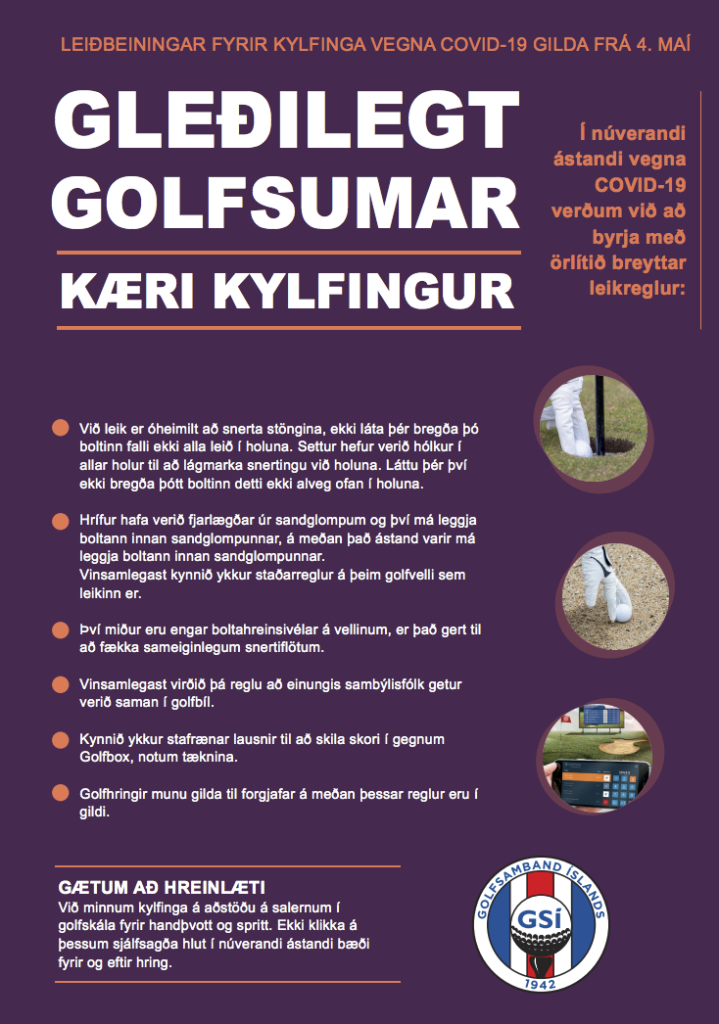 Kylfingar er hvattir til þess að sinna persónulegum sóttvörnum í hvívetna, virða tveggja metra fjarlægðarmörk og forðast hópamyndanir á golfvallasvæðunum, s.s. við golfskála og á bílastæðum.