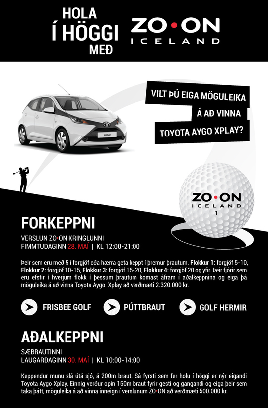 Aðalkeppnin fer síðan fram á Sæbrautinni 30. maí kl. 10-14. Keppendur munu slá út á sjó á 200 m braut. Sá fyrsti sem fer holu í höggi verður eigandi nýrrar Toyota Aygo Xplay.